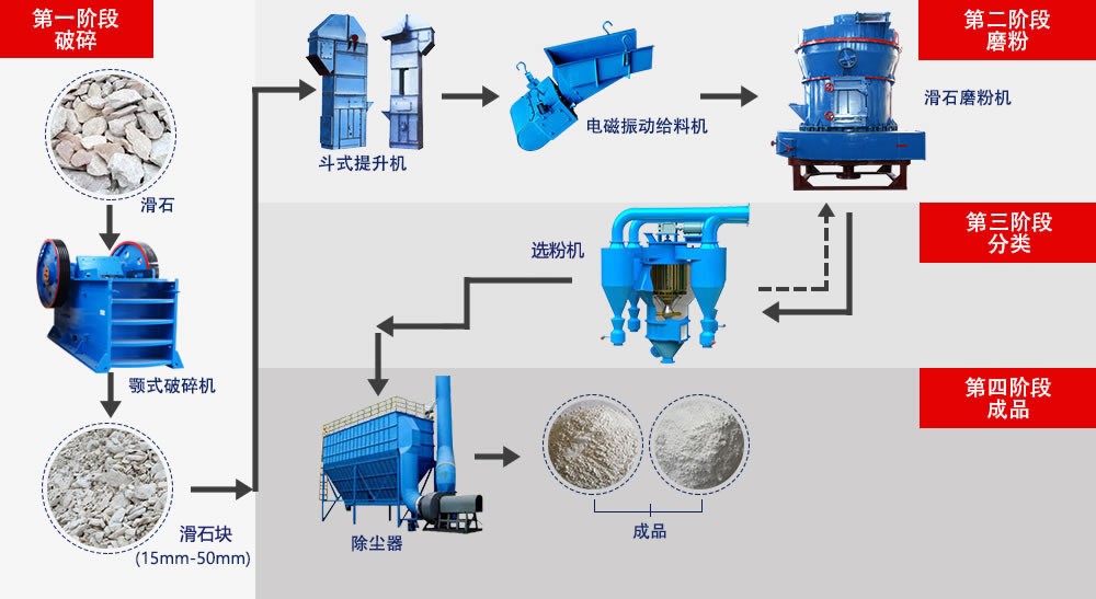 首先,大塊的滑石需要先用顎式破碎機(jī)進(jìn)行破碎處理,破碎后的滑石由斗式提升機(jī)送入到儲(chǔ)料倉(cāng)中;而后電磁振動(dòng)給料機(jī)將料倉(cāng)中的滑石均勻的給入到雷蒙磨粉機(jī)內(nèi)進(jìn)行磨粉作業(yè);
